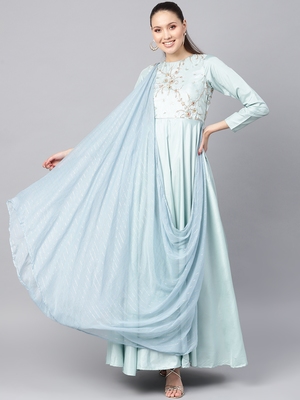 Powder Blue Silk Blend Embroidered Maxi Dress